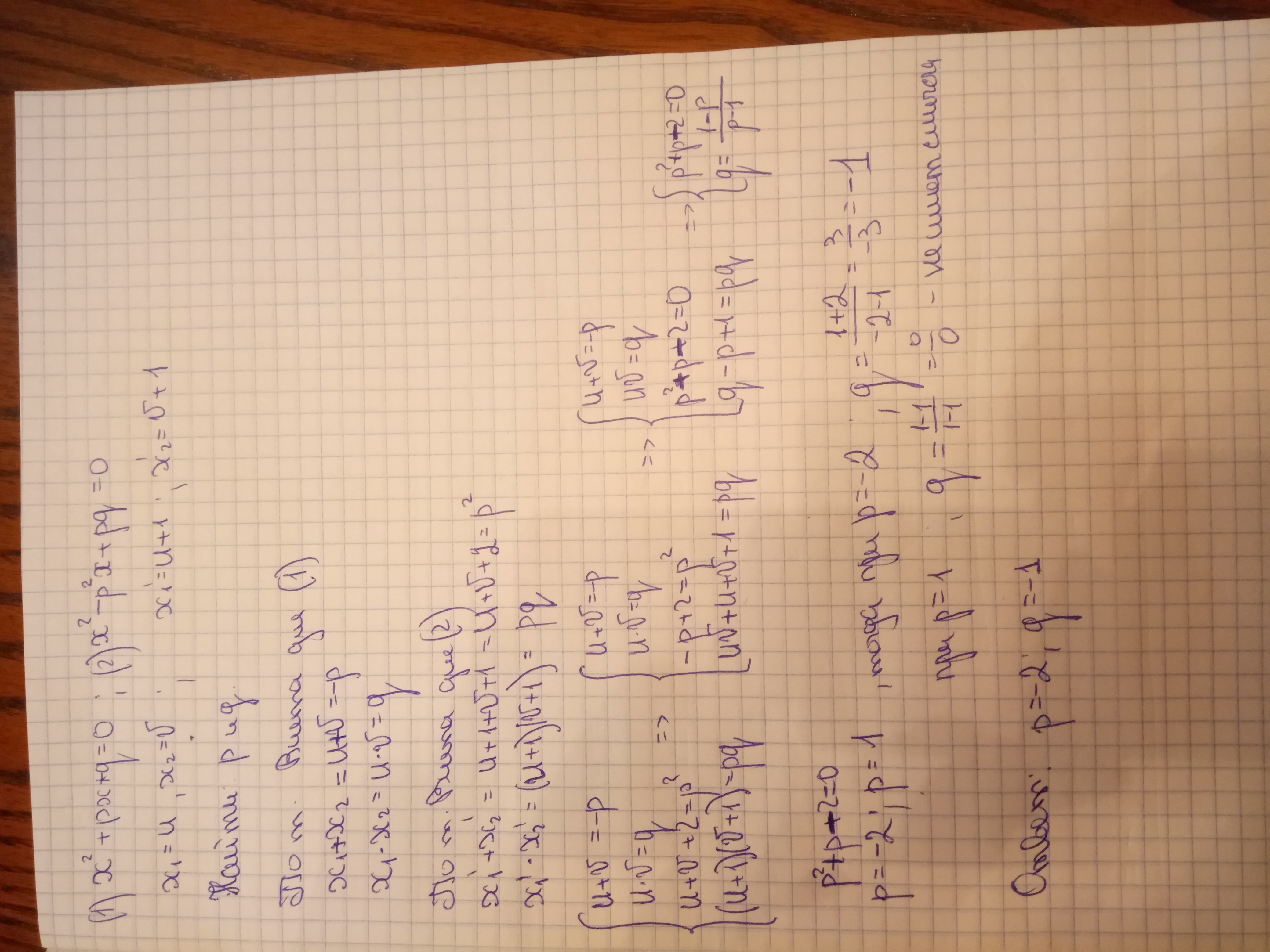Если корни x(квадрат)+px+q=0 равны u и v, тогда цифры u+1 и v+1 корни уравнения x(квадрат)-p(квадрат)x+pq=0.Найди p и q!