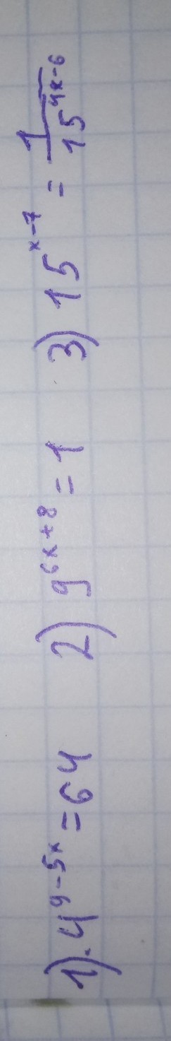 1); ; 4^{9-5x}=64; ; to ; ; 4^{9-5x}=4^3\\9-5x=3; ,; ; 5x=6; ,; ; x=frac{6}{5}; ,; ; underline {x=1,2}\\\2); ; 9^{6x+8}=1; ; to ; ; 9^{6x+8}=9^0\\6x+8=0; ,; ; 6x=-8; ,; ; x=-frac{8}{6}; ,; ; underline {x=-frac{1}{3}}\\\3); ; 15^{x-7}=frac{1}{15^{4x-6}}; ; to ; ; 15^{x-7}=15^{6-4x}; ,\\x-7=6-4x; ,; ; 5x=13; ,; ; x=frac{13}{5}; ,; ; underline {x=2,6}