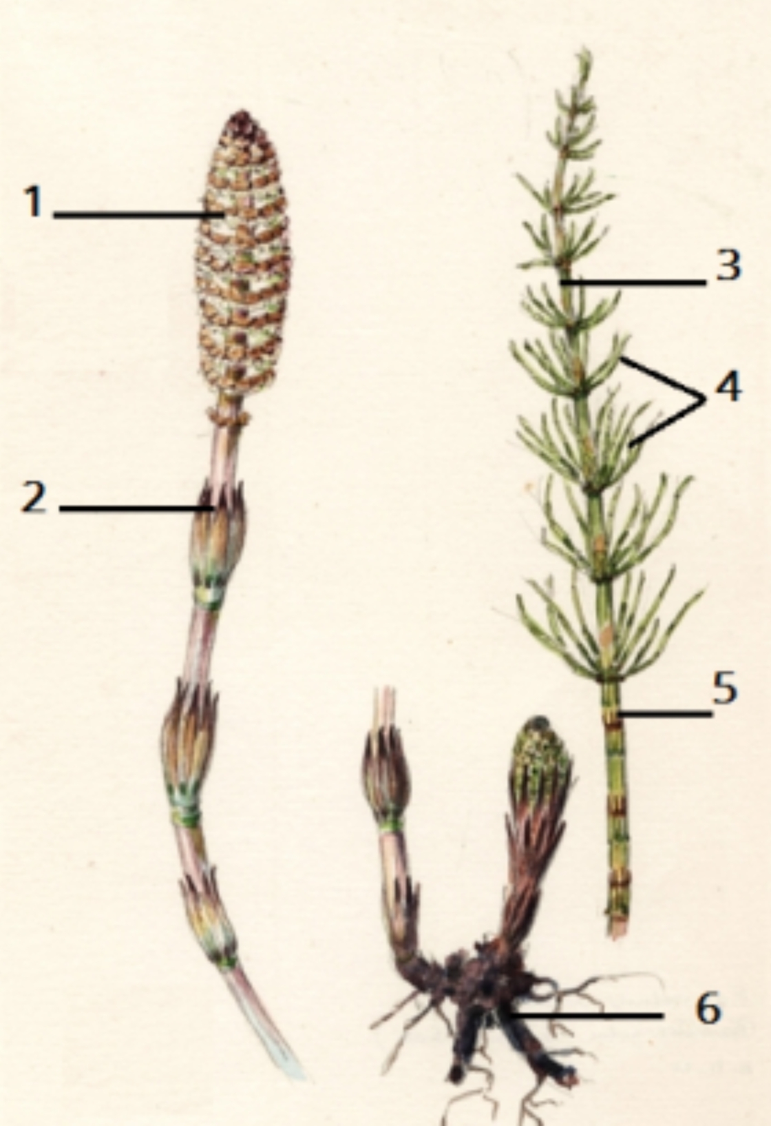 У хвоща полевого весенние и летние побеги отличаются. Рассмотри рисунок и ответь на вопросы.