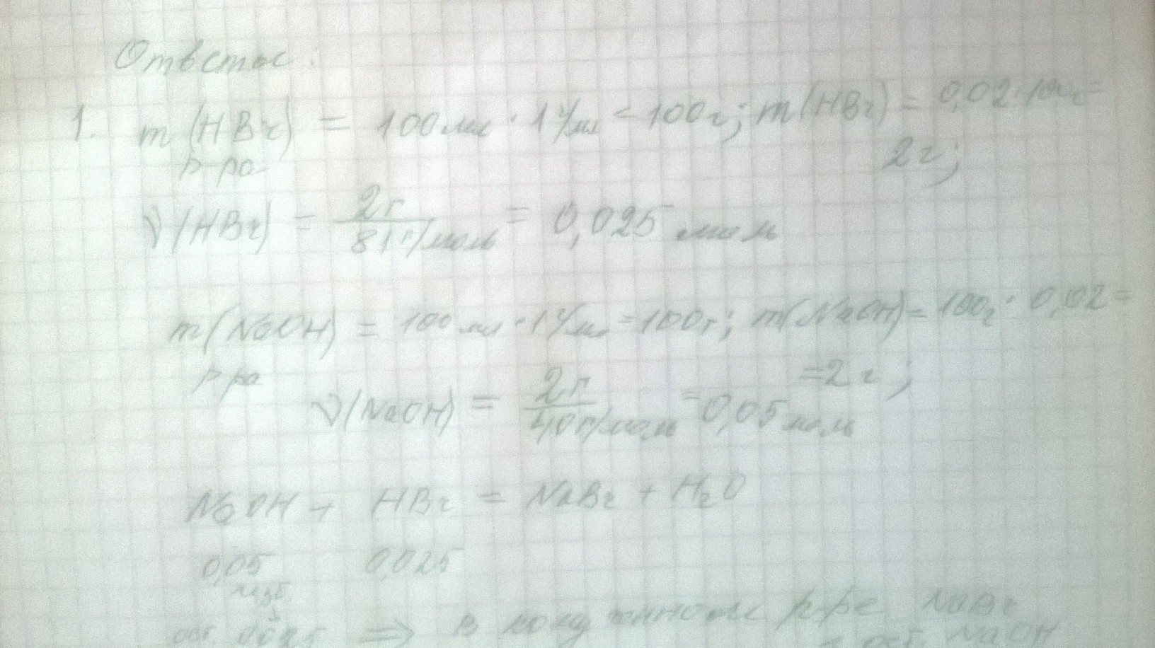К 100 мл 2%-го раствора HBr прилили 100 мл 2%-го р-ра NaOH. Рассчитайте процентную концентрацию в-ва в образ.растворе, плотность = 1.