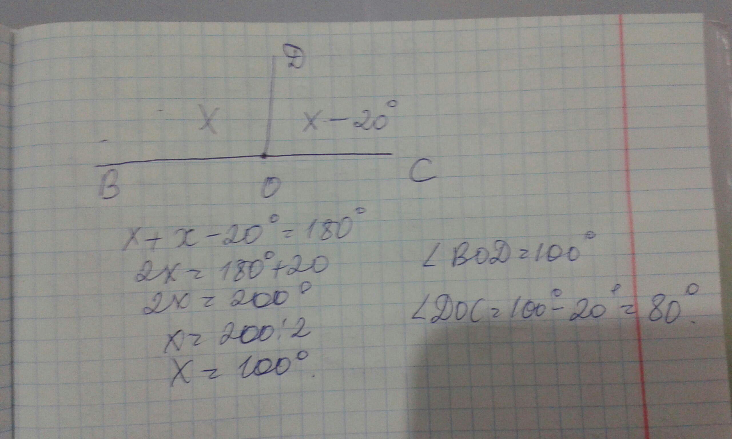 п.2.6 Внутри развернутого угла ВОС провели луч ОД так. что угол ДОС на 20 градусов меньше угла ДОВ. Найдите углы ДОС и ДОВ