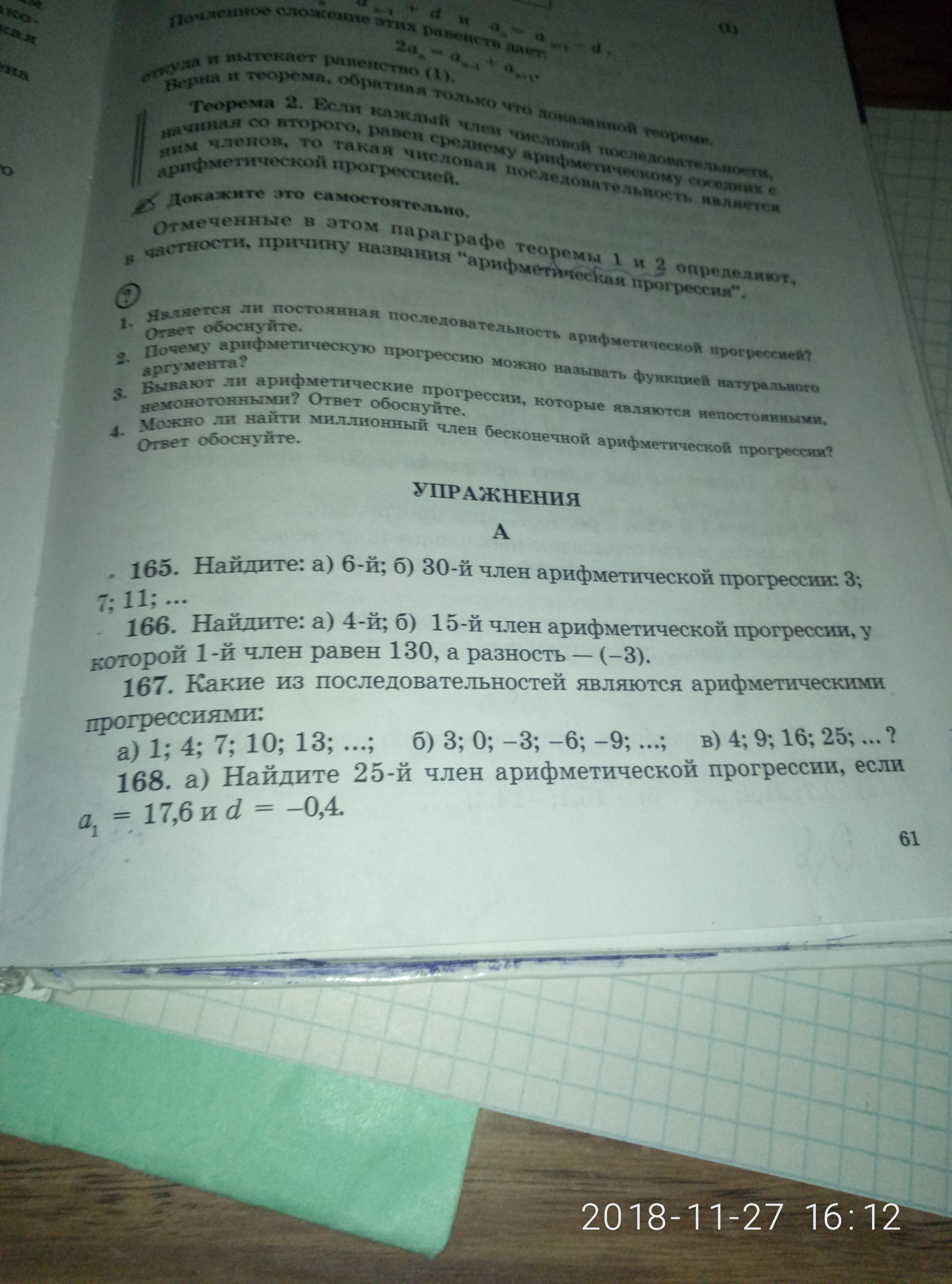 К примеру номер 165. Прогрессия 3, 7, 11.. Подставляем в формулу. шестой член (его просят найти) = 3 (то есть первый член прогрессии) + 4 (тк 7-3=4, значит прогрессия возрастает на 4) умножить на 6-1(извини я там неправильно написала, не 4-1, а 6-1. и ответ в 165шестой член=23 )(тк 6 это член который мы ищем,а -1 мы пишем всегда)