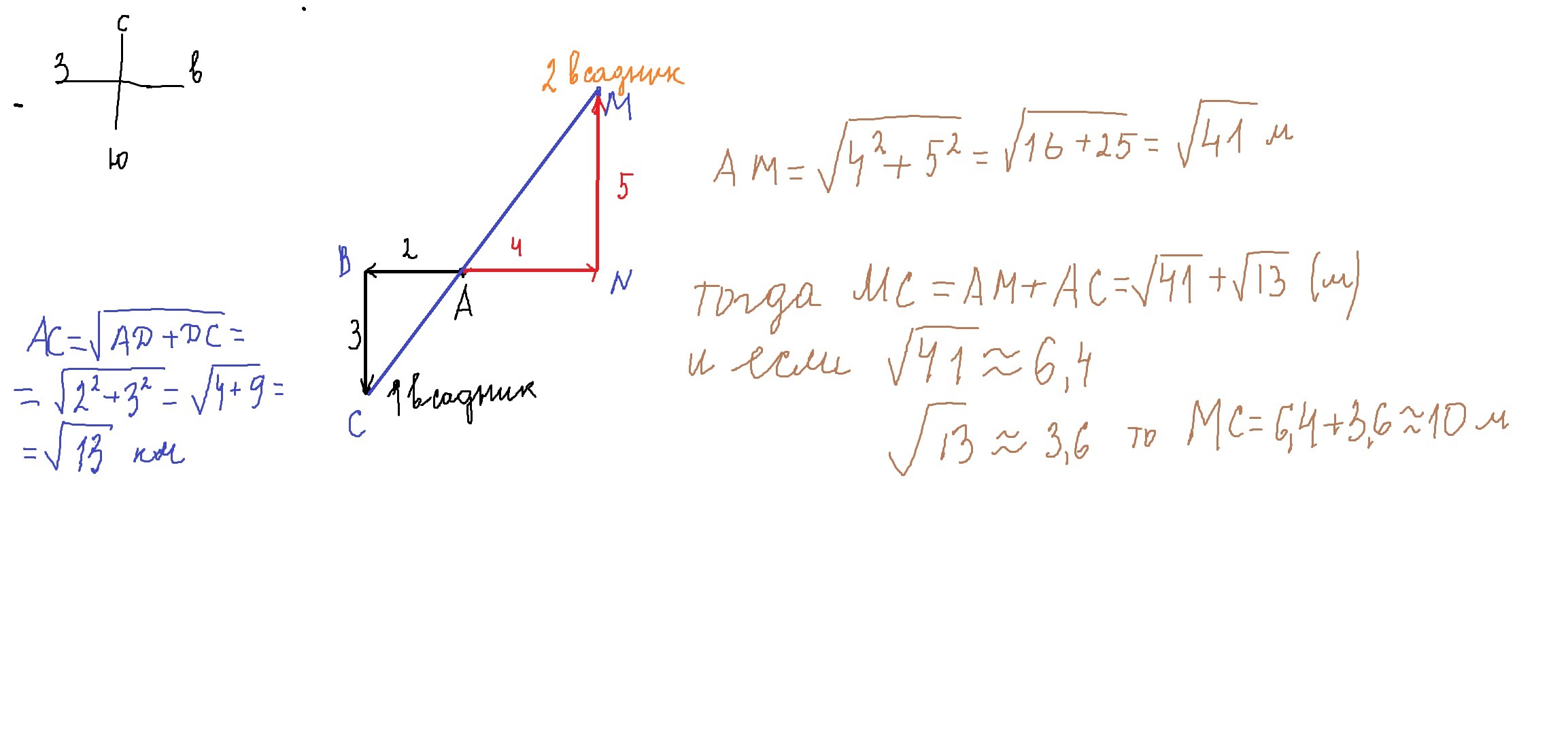 не знаю,для какого класса задача,но смогла решить по т.Пифагора,сделав чертеж.Если не так-извини.