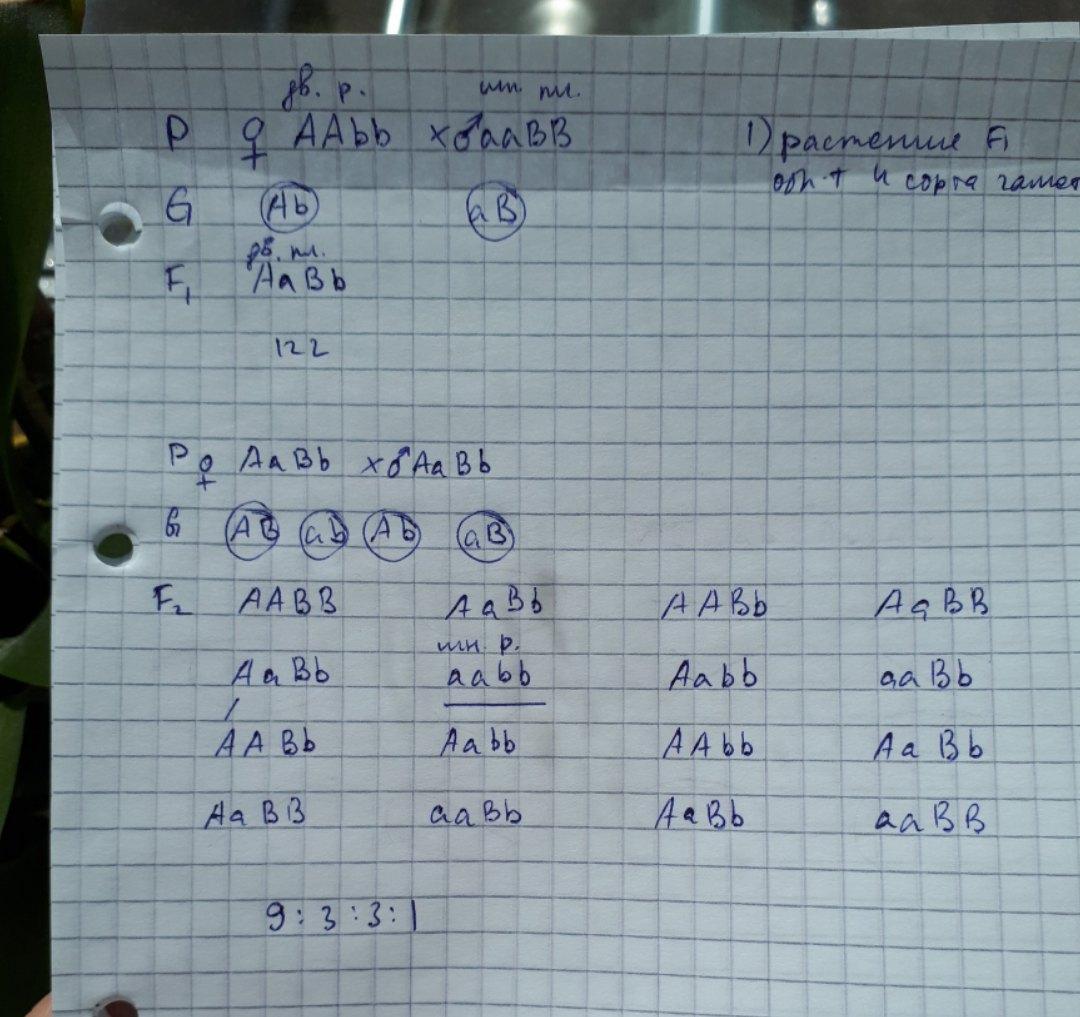 2) расщепление по фенотипу 9:3:3:1, такой признак у одного растения