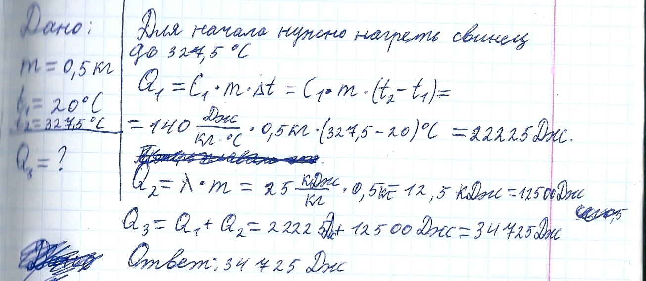 определить количество теплоты необходимое для перевода свинца массой 500гр при температуре 20град. по Цельсию в расплавленное состояния при температуре плавления.