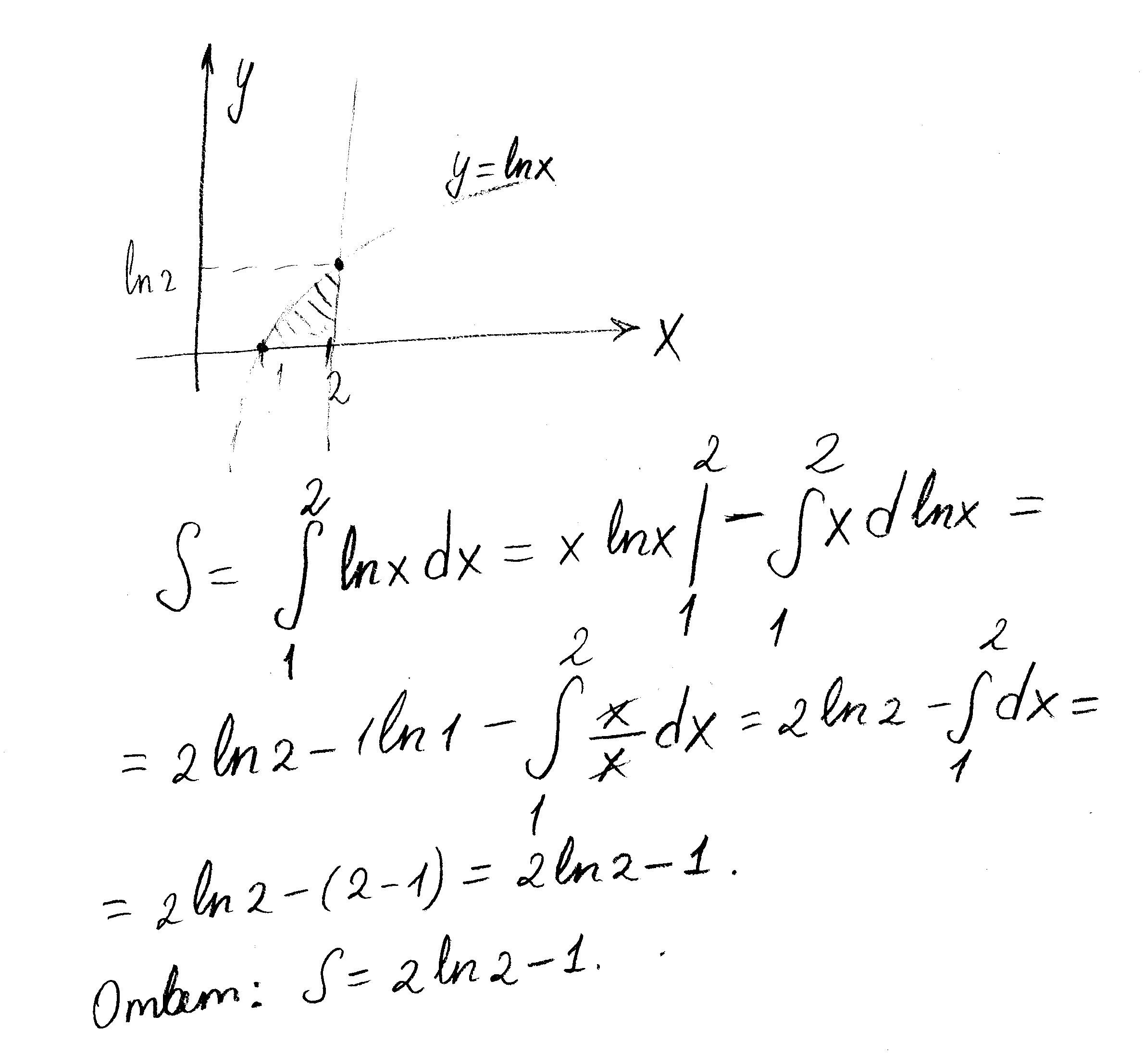 Найти площадь фигуры, ограниченной линиями: y=ln x y=0 x=2