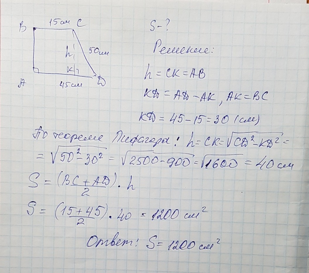 Дано:ABCD-прямоуг.трапеция. угол А 90 градусов AD 45 см BC 15 см CD 50 см Найти S abcd