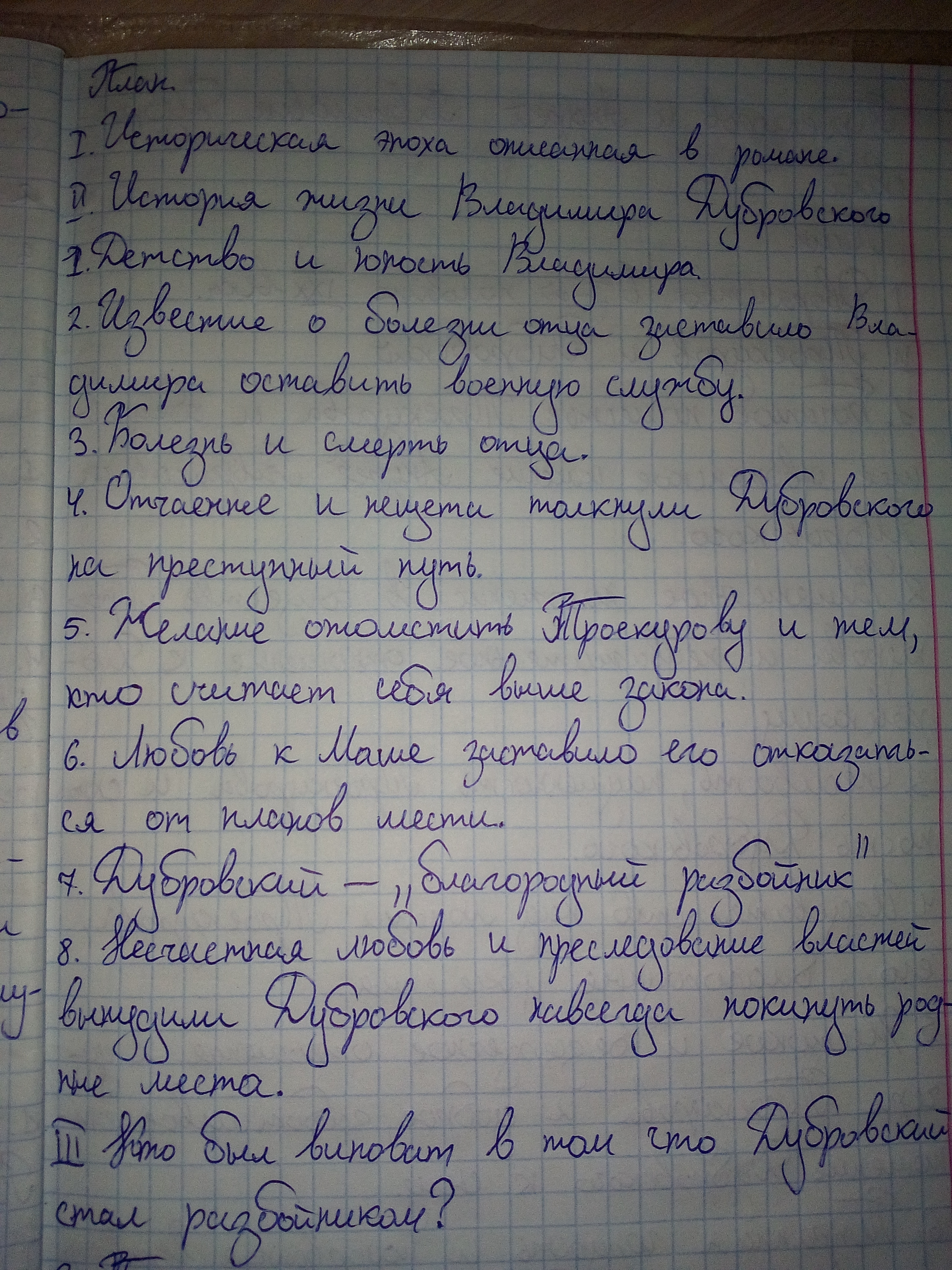 7) Владимир Дубровский – благородный разбойник. Он смелый, добрый, благородный, не тщеславный и справедливый человек. Хоть и как у каждого человека, у него были свои минусы: мстительность, обидчивость. Однако света в нём было больше.