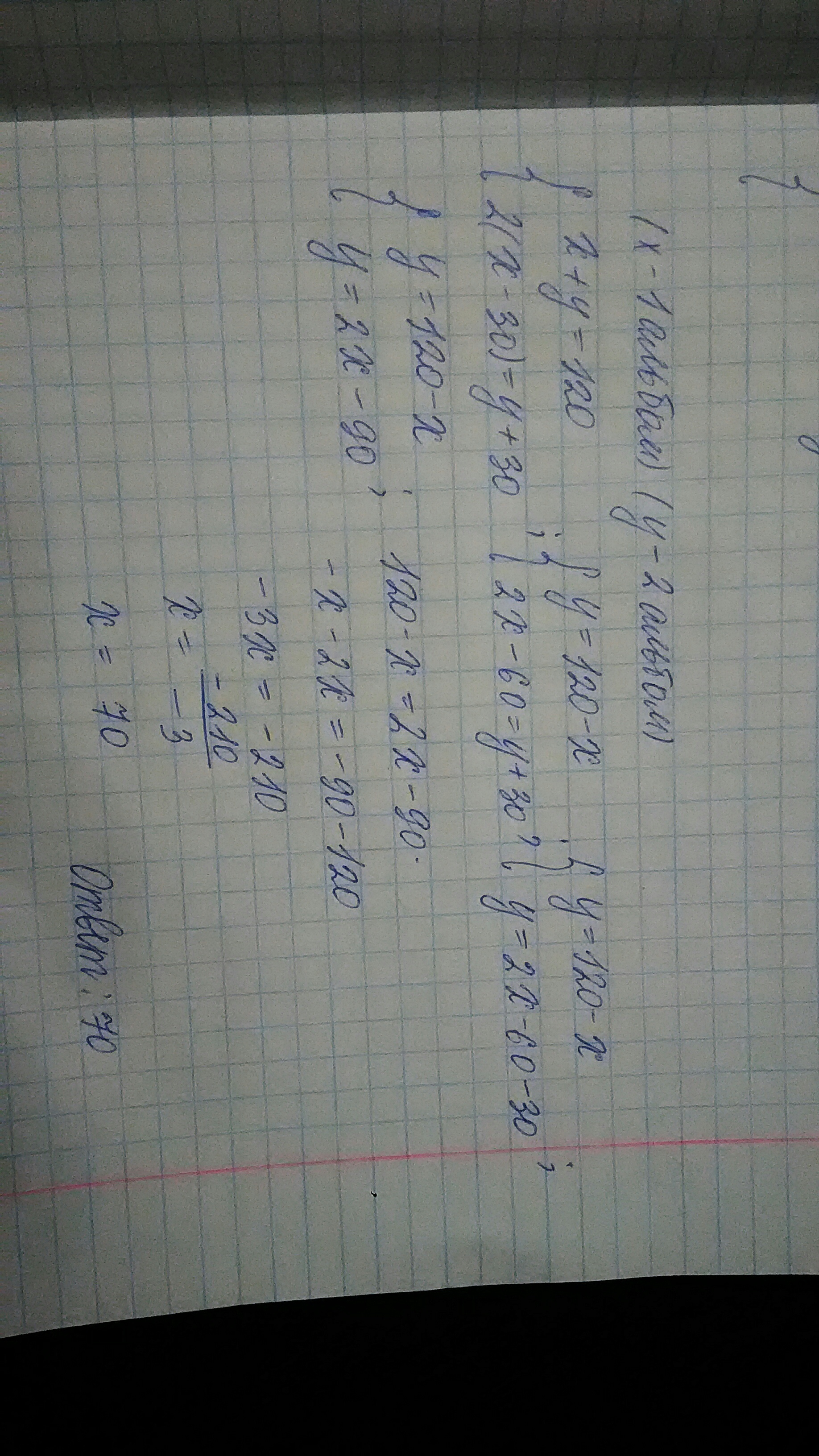 70+у=120. у=120-70=50. Если от первого переложить во второй 30, то он будет в 2 раза меньше его. 70-30 в 2 раза меньше чем 50+30. 40 в 2 раза меньше 80