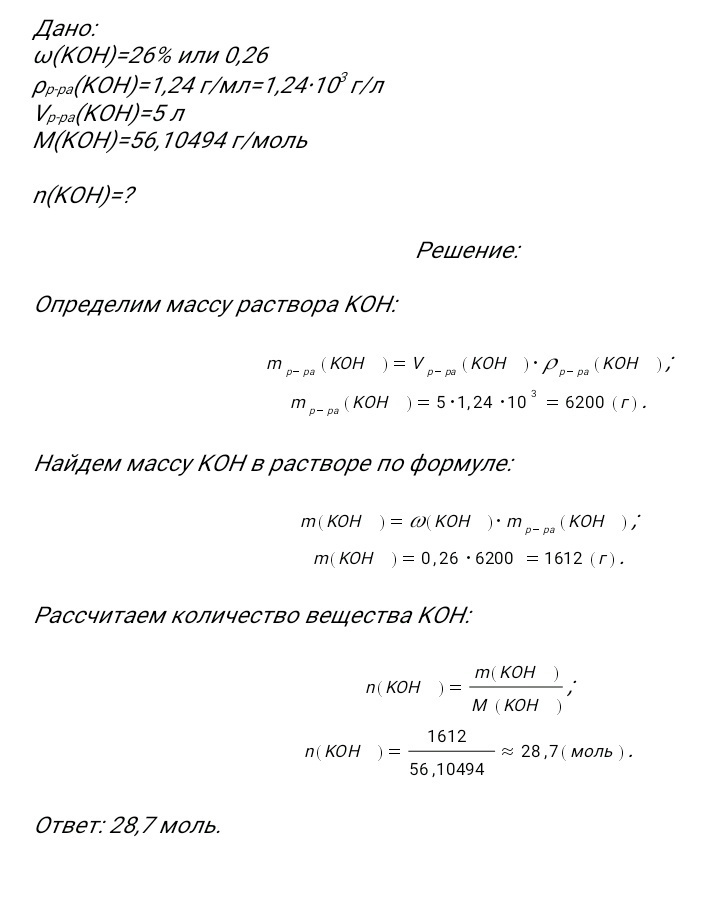 Плотность 26%-ного (по массе) раствора KOH равна 1.24г/моль .Сколько молей KOH находится в 5л растворе? Помогите пожалуйста решить задач?