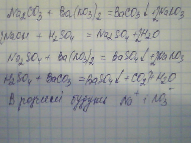 До розчину, що містить суміш карбонату і натрій гідроксиду, спочатку додали надлишок розчину барій натрію, а потім - сульфатної кислоти. Які йони залишились у розчині? Напишіть рівняння реакцій.