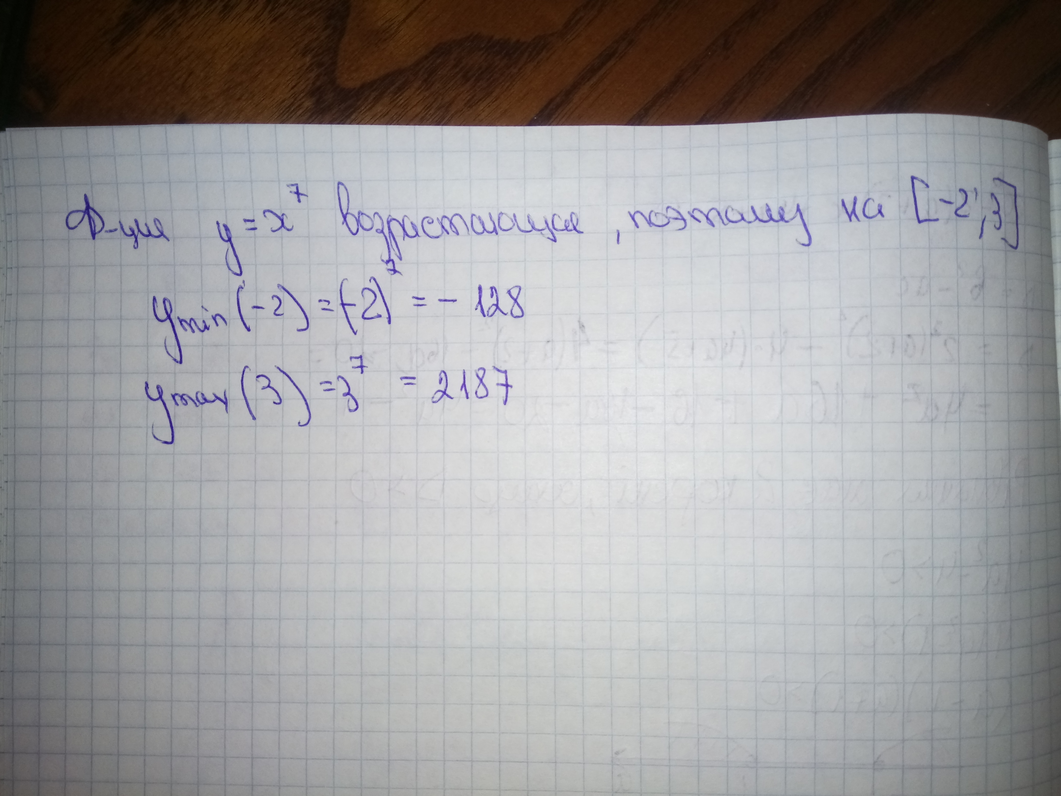 №1.Найти наибольшее и наименьшее значение функции на заданном отрезке1) у=х^7, х пренадлежит [-2; 3]
