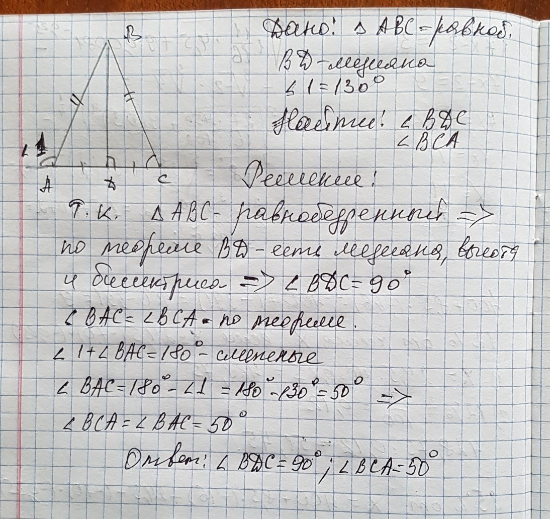 Угол ВСА в этом треугольнике равен углу ВАС так как треугольник равнобедренный. Угол ВАС равен 180-130=50 градусов, так как он смежный с углом 1. Значит угол ВСА также равен 50 градусов