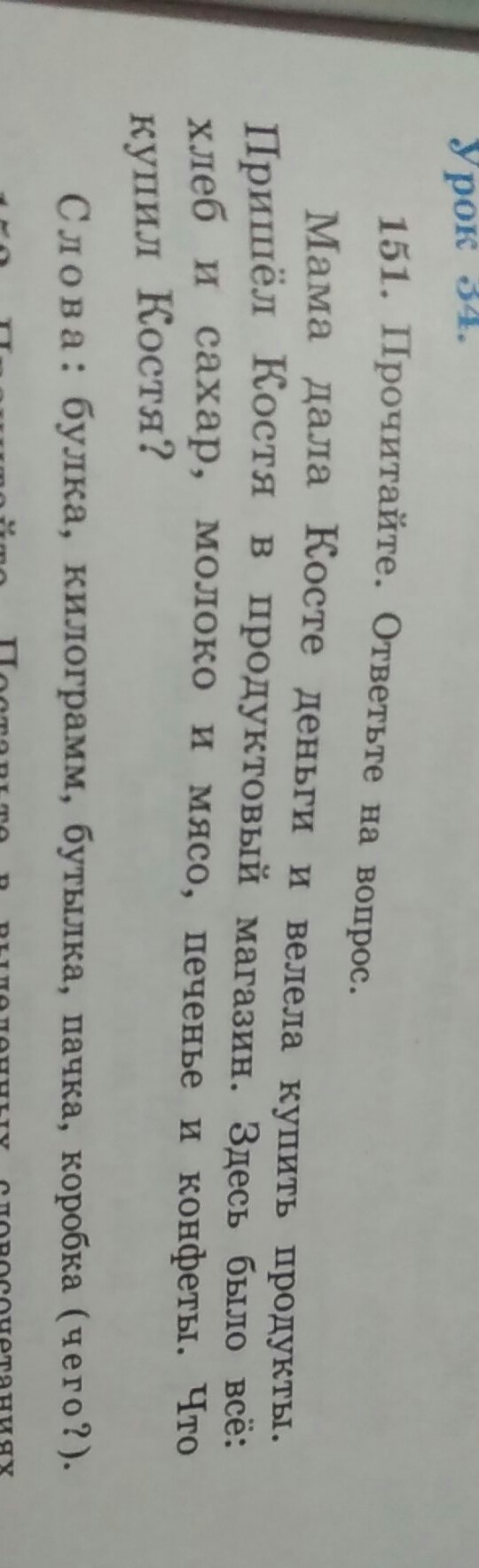 Костя купил булку хлеба, килограмм сахара, килограмм мяса, бутылку молока, пачку печенья, коробку конфет.