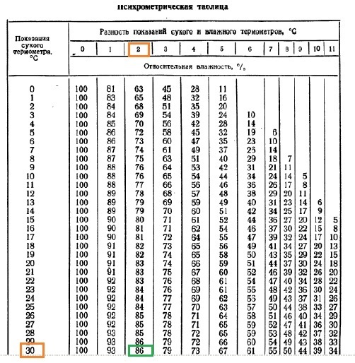 показание сухого термометра 30град по Цельсию , влажного 28 град по Цельсию . определить относительную влажность при нормальном атм. давлении