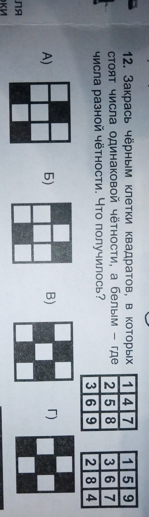 Закрась черным клетки квадратов, в которых стоят числа одинаковой чётности, а белым где числа числа разной чётности. Что получилось?