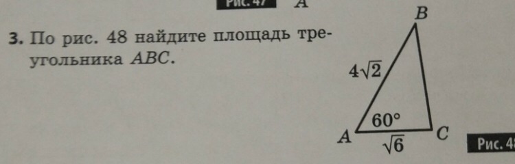 S=12 AB*AC*sin ∠A=12*4√2*√6*sin 60°=6 кв.ед