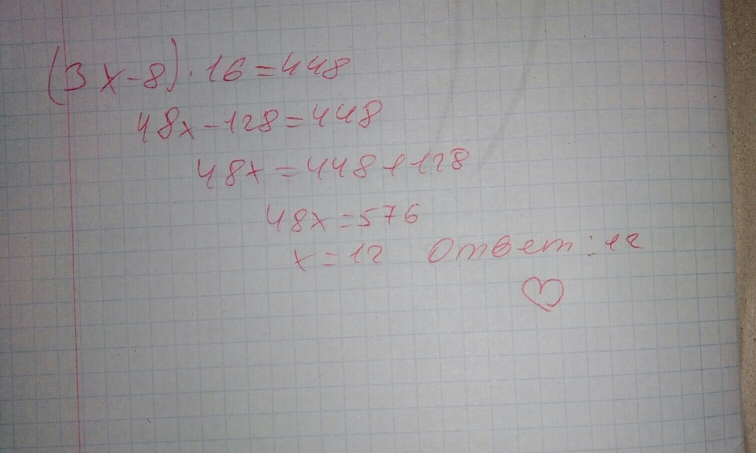 ( 3х - 8 ) × 16 = 448