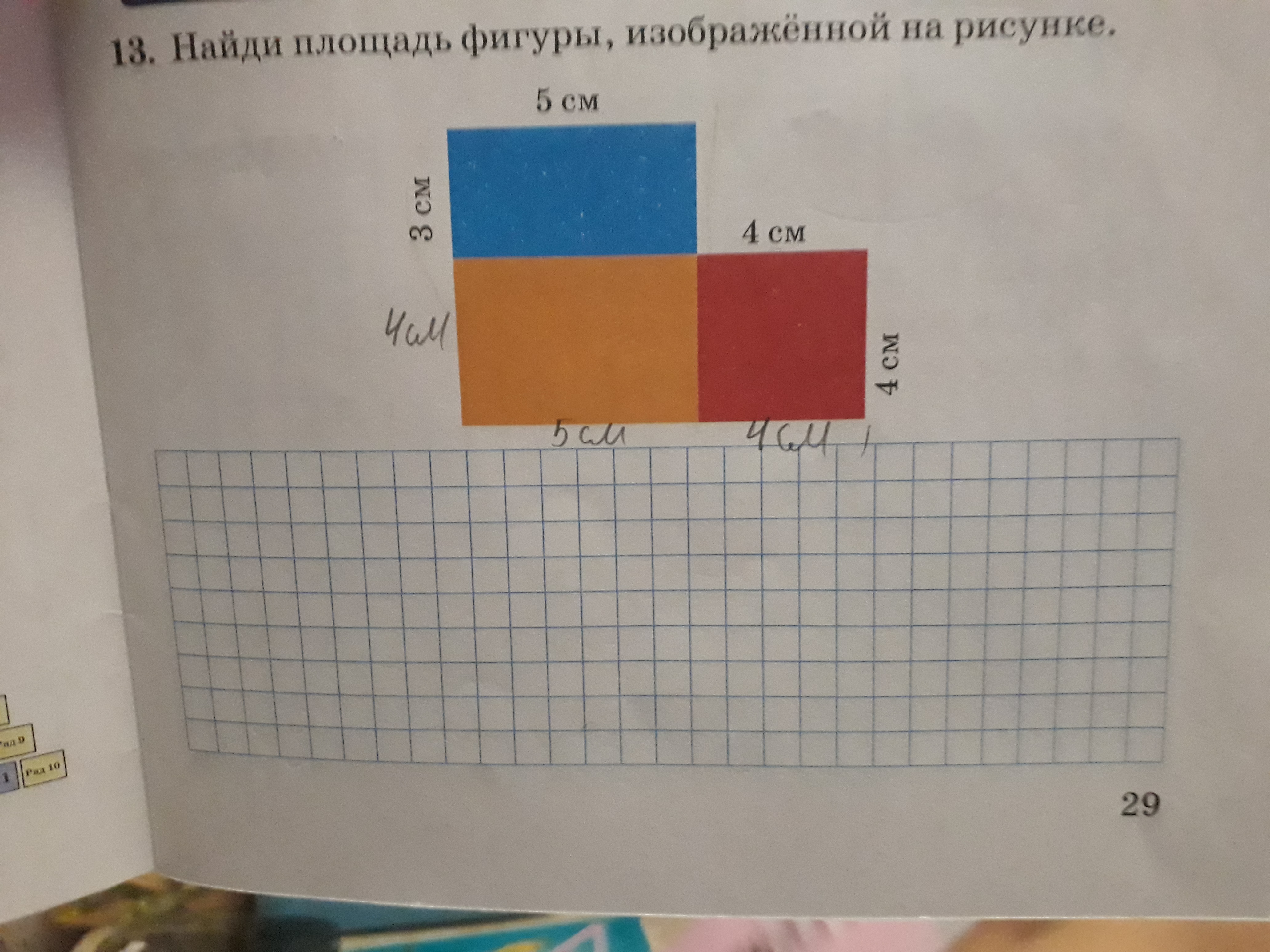 ширину умножить на длину, если квадрат то сторону умножить на сторону; синий -5×3; красный 4×4; жёлтый - 4×5
