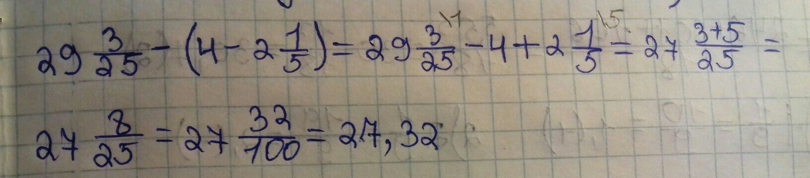 29 3/25 -(4-2 1/5)=728/25-(4-11/5)=728/25-9/5=683/25 или 27 8/25 или 27,32