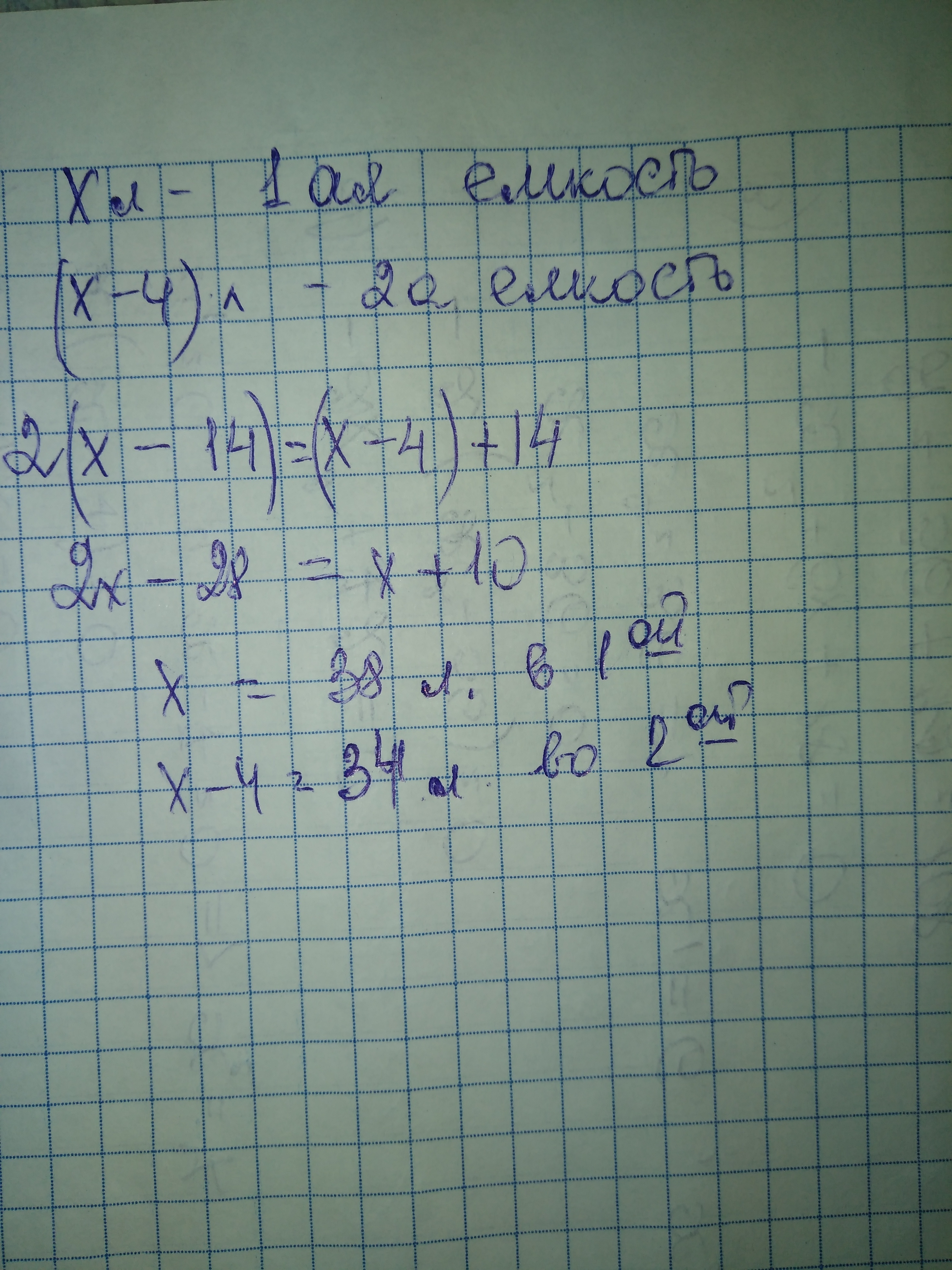 В первой ёмкости на 4 л воды больше, чем во второй. Если из первой ёмкости перелить во вторую 14 л воды, то во второй ёмкости станет в 2 раза больше, чем останется в первой. Сколько литров воды в каждой ёмкости?