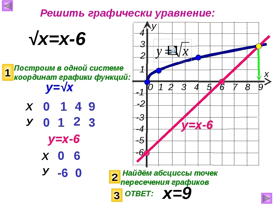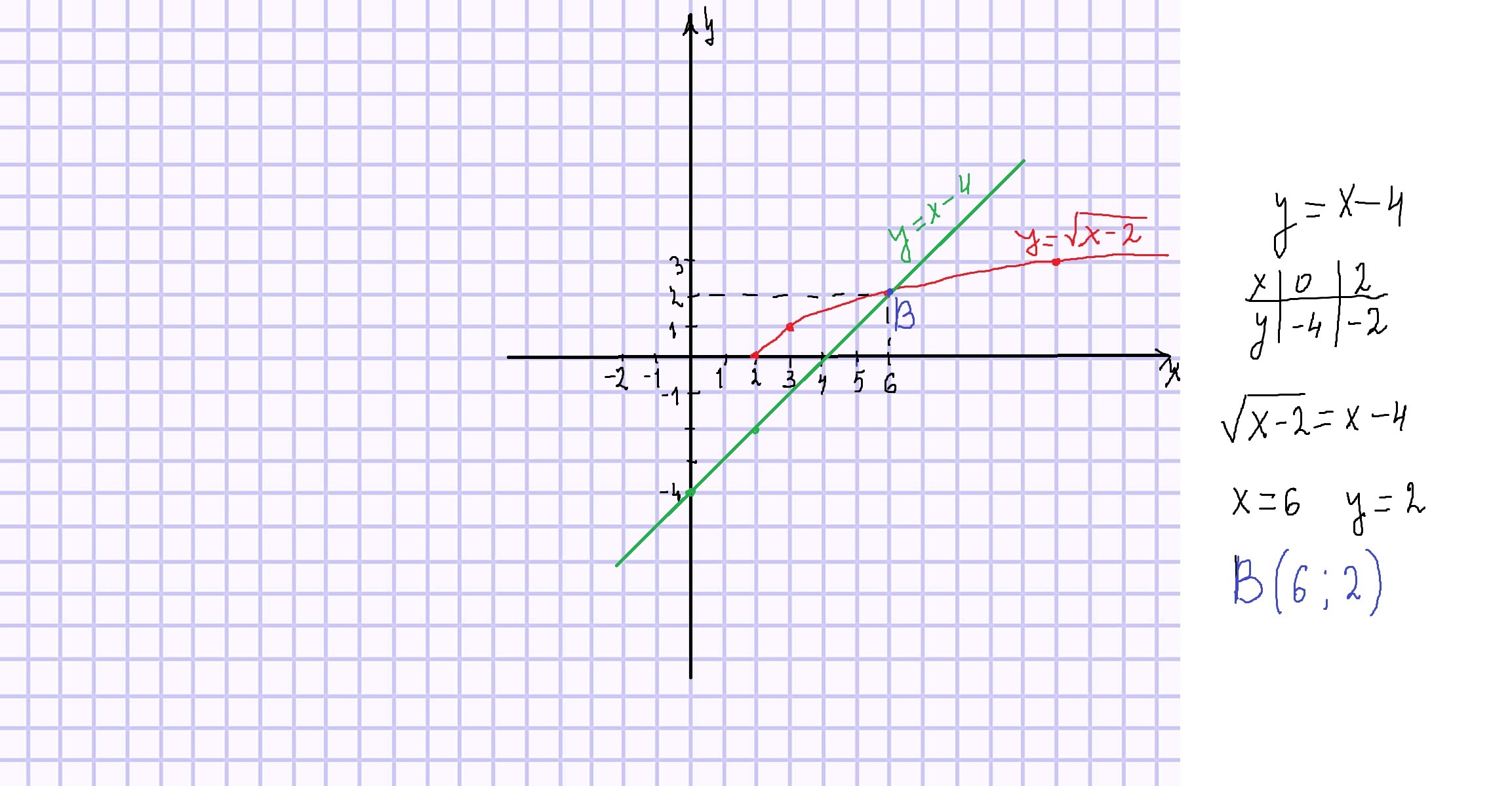 аналогично строим графики для 2 уравнения у=√х-2(получается сдвигом графика у=√х на 2 вправо) и графика у=х-4 и находим т.пересечения этих графиков т.В(6;2)