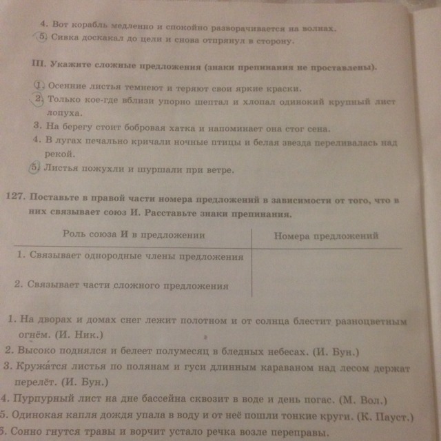 Поставьте в правой части номера предложений в зависимости от того, что в них связывает союз И. Расставьте знаки препинания.
