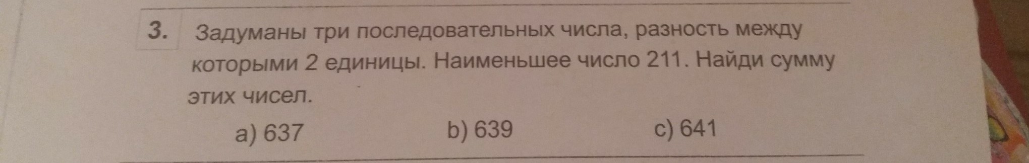 Нам известно что самое наименьшее число это 211, также мы знаем что всего у нас должно получиться 3 числа и каждое большо предедущего на 2, значит мы к 211 прибавляем 2: