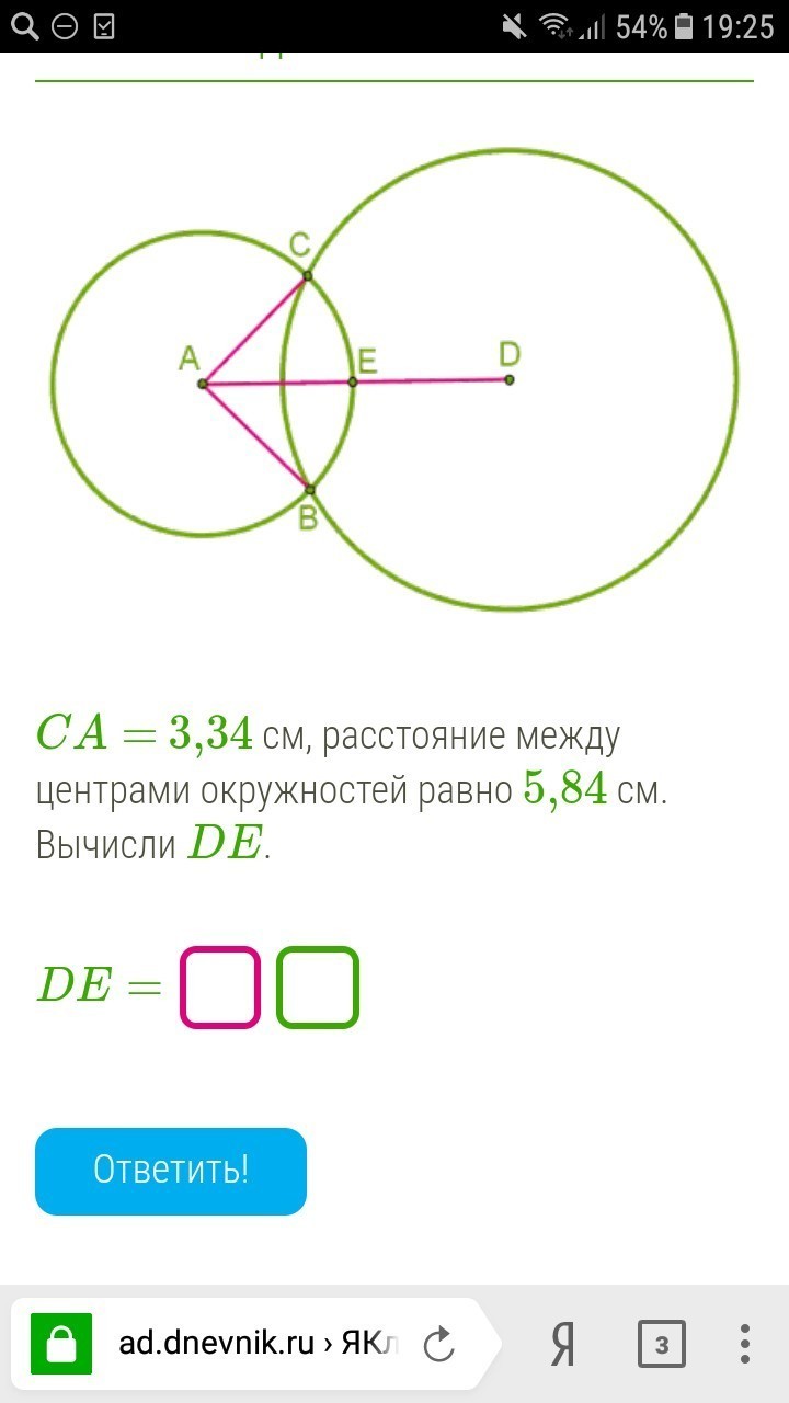 CA = AE т к это радиусы, а они равны, следовательно DE = DA - AE = 5,84 - 3,34 = 2,5