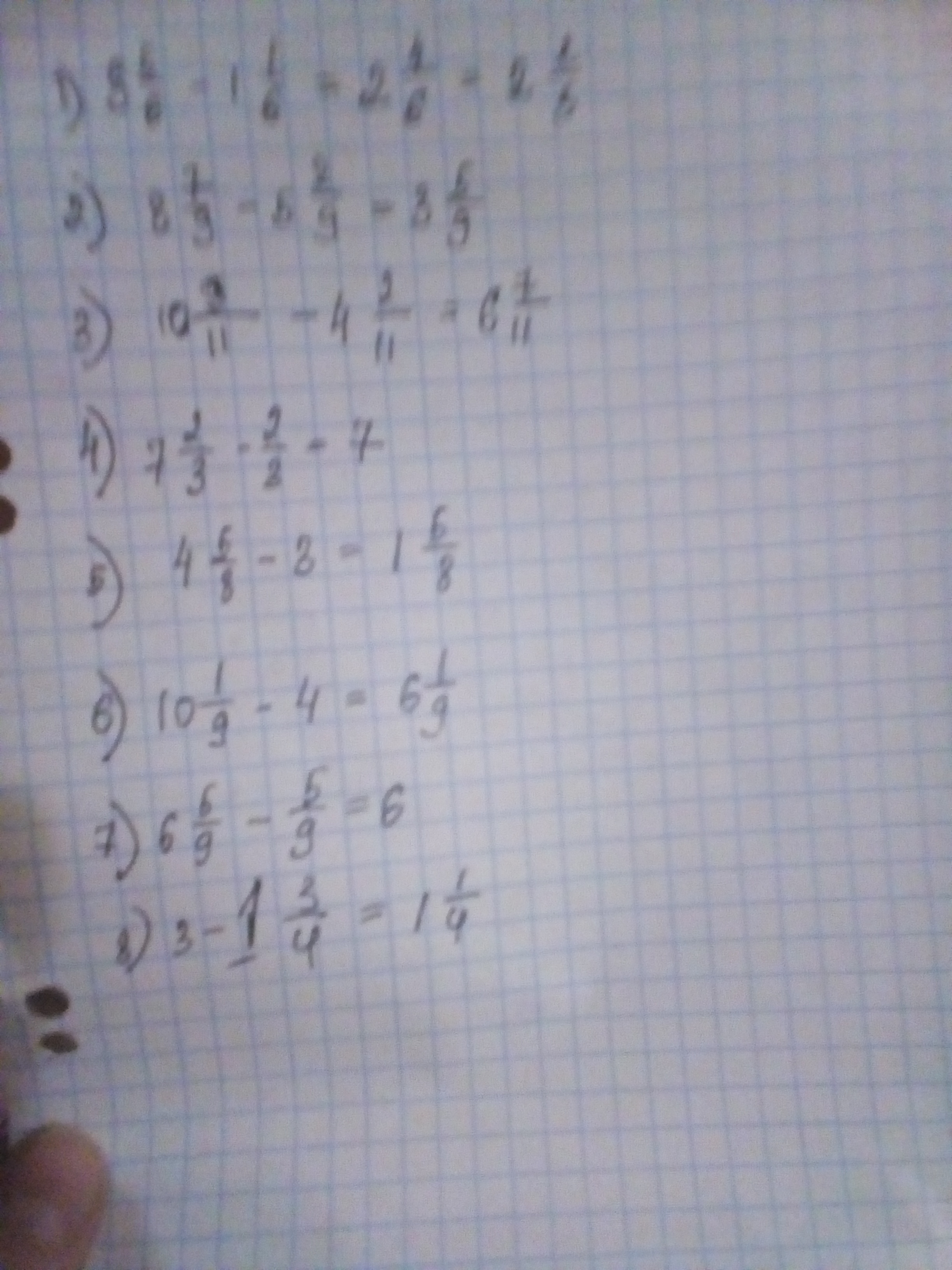 Найдите значение выражения 1)3 целых 5/6-1 целых 1/6 2)8 7/9-5 2/9 3)10 9/11-4 2/11 4)7 2/3-2/3 5)4 5/8-3 6)10 1/9-4 7)6 5/9-5/9 8)3-1 3/4 пожалуйста помгите