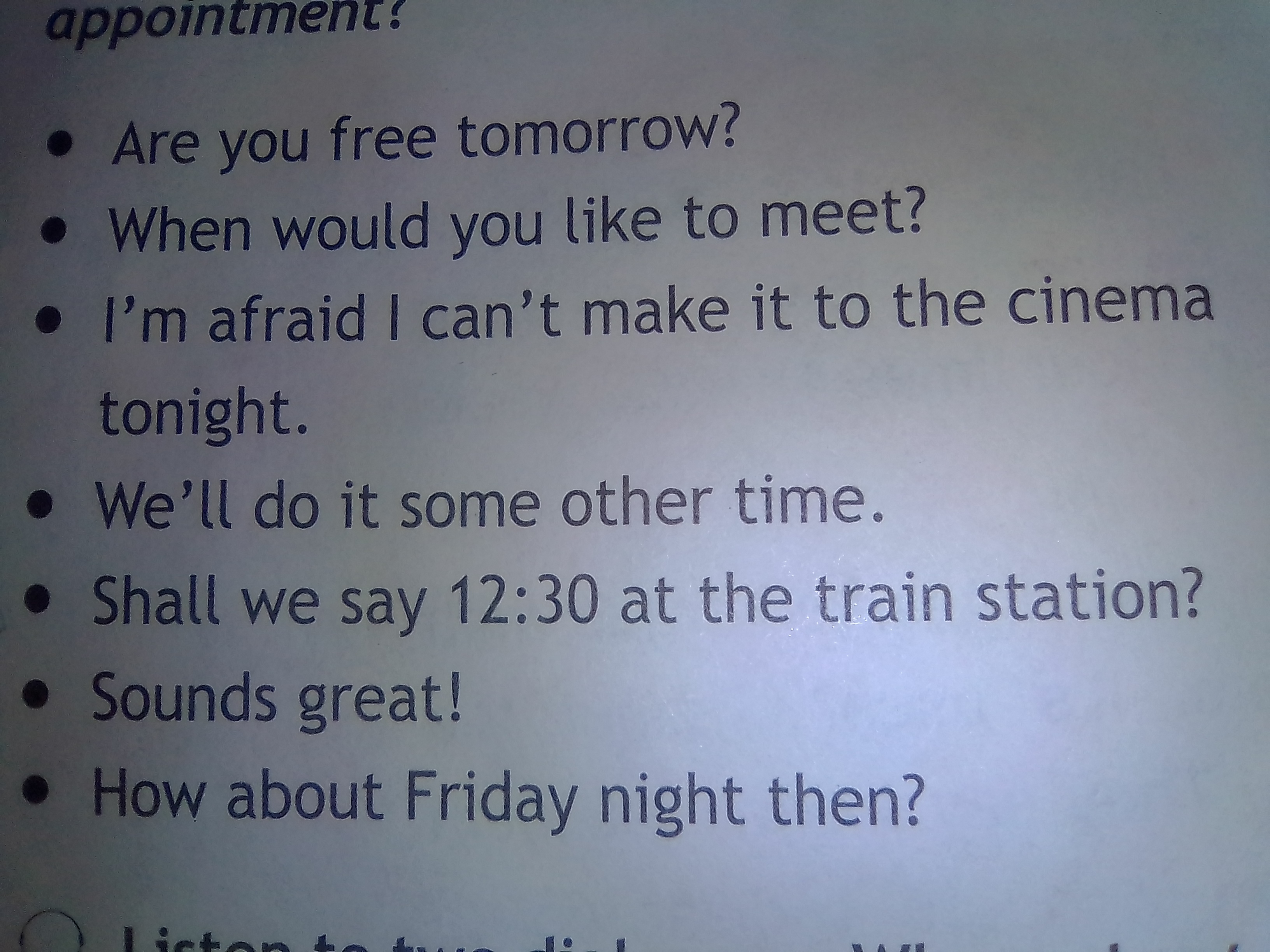 Ты завтра свободен?когда вы хотели встретиться?боюсь сегодня я не могу попасть в кино.мы сделаем это в другой раз.скажем 12:30 на вокзале?звучит здорово!