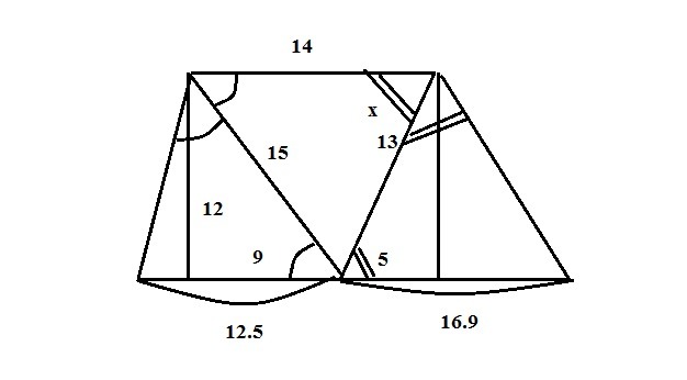 Биссектрисы тупых углов при основании трапеции пересекаются на второй ее основе и имеют длины 13 и 15 см. найдите стороны трапеции, если ее высота 12 см