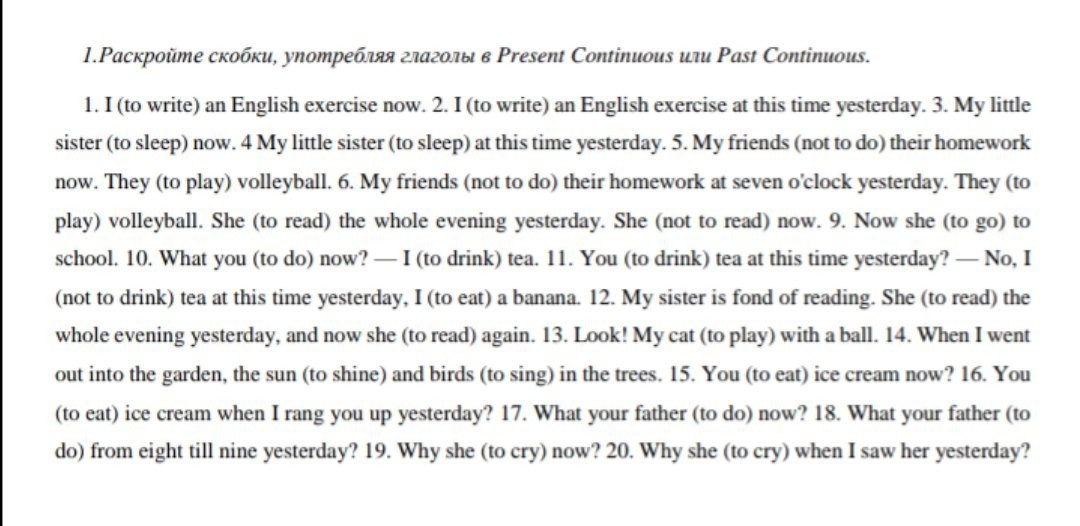 I AM WRITING an English exercise now. 2 I WAS WRITING an English exercise at this time yesterday, 3. My little sister IS SLEEPING now. 4 My little sister WAS SLEEPING at this time yesterday. 5. My friends ARE NOT DOING their homework now. They ARE PLAYING volley-ball. 6. My friends WERE NOT DOING their homework at seven o'clock yesterday. They WERE PLAYING volley-ball. 7. ARE You EATING ice-cream now? 8. WERE You EATING ice-cream when I rang you up yesterday? 9. What IS your father DOING now? 10. What WAS your father DOING from eight till nine yesterday? 11. Why IS she CRYING now? 12. Why WAS she CRYING when I saw her yesterday? 13. She WAS READING the whole evening yesterday. 14. She IS NOT READING now, 15. Now she IS GOING to school. 16. What ARE you DOING now? —-I AM DRINKING tea. 17. WERE You DRINKING tea at this time yesterday? — No, I WAS NOT DRINKING tea at this time yesterday, I WAS EATING a banana. 18. My sister is fond of reading. She WAS READING the whole evening yesterday, and now she IS READING again, 19. Look! My cat IS PLAYING with a ball. 20. When I went out into the garden, the sun WAS SHINING and birds WERE SINGING in the trees.
