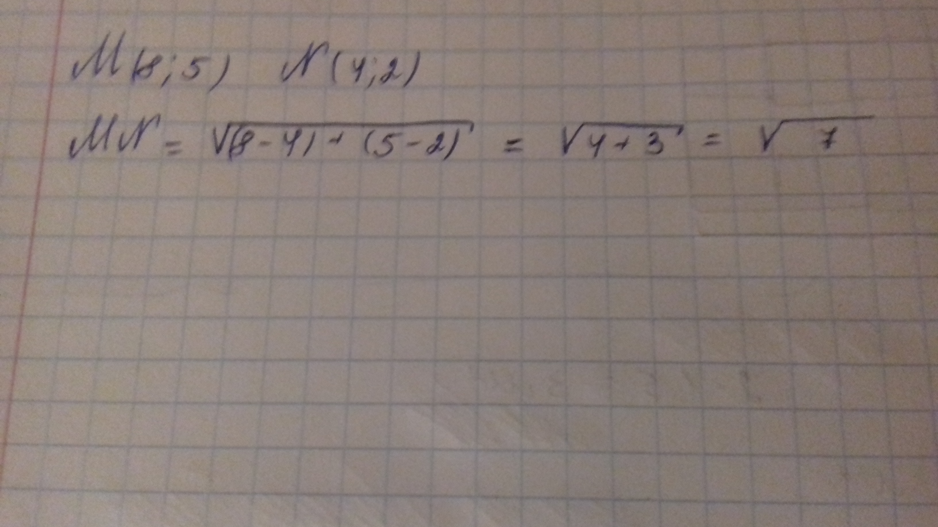 MN= корень(8-4)+(5-2)=корень 4+3=корень7