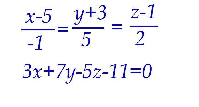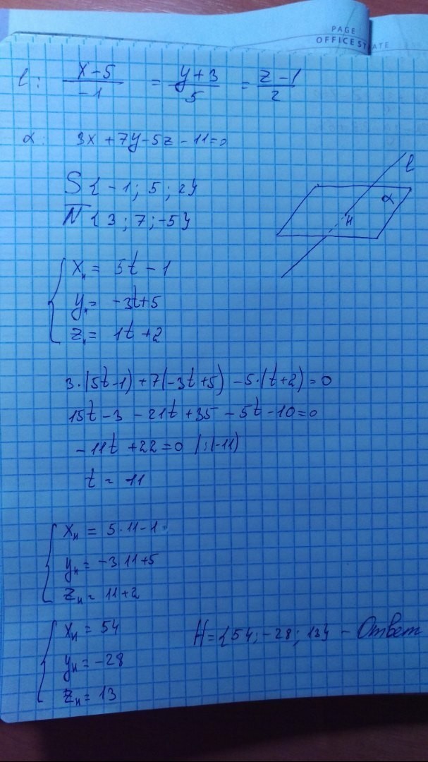 Чтоб найти точку пресечения, мы должны составить параметрическое уравнение прямой и за тем подставить получившиеся значения в уравнение плоскости, мы находим переменную, которая поможет нам найти точку пересечения и подставляем ее в параметрическое уравнение прямой.