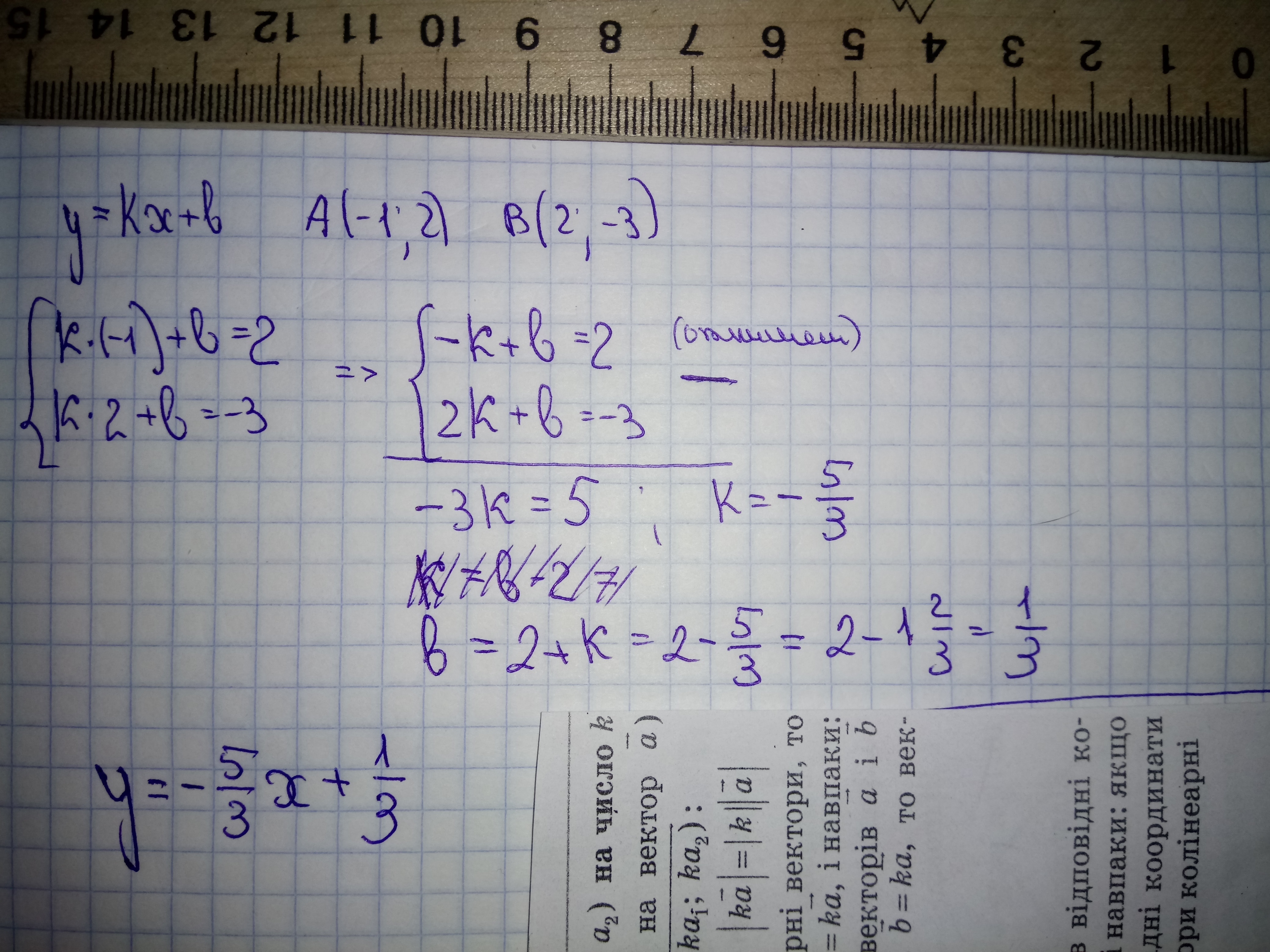 Известно, что график функции у=кх+b проходит через точку А(-1;2) и точку B(2;-3). Запишите формулу, задающую эту функцию