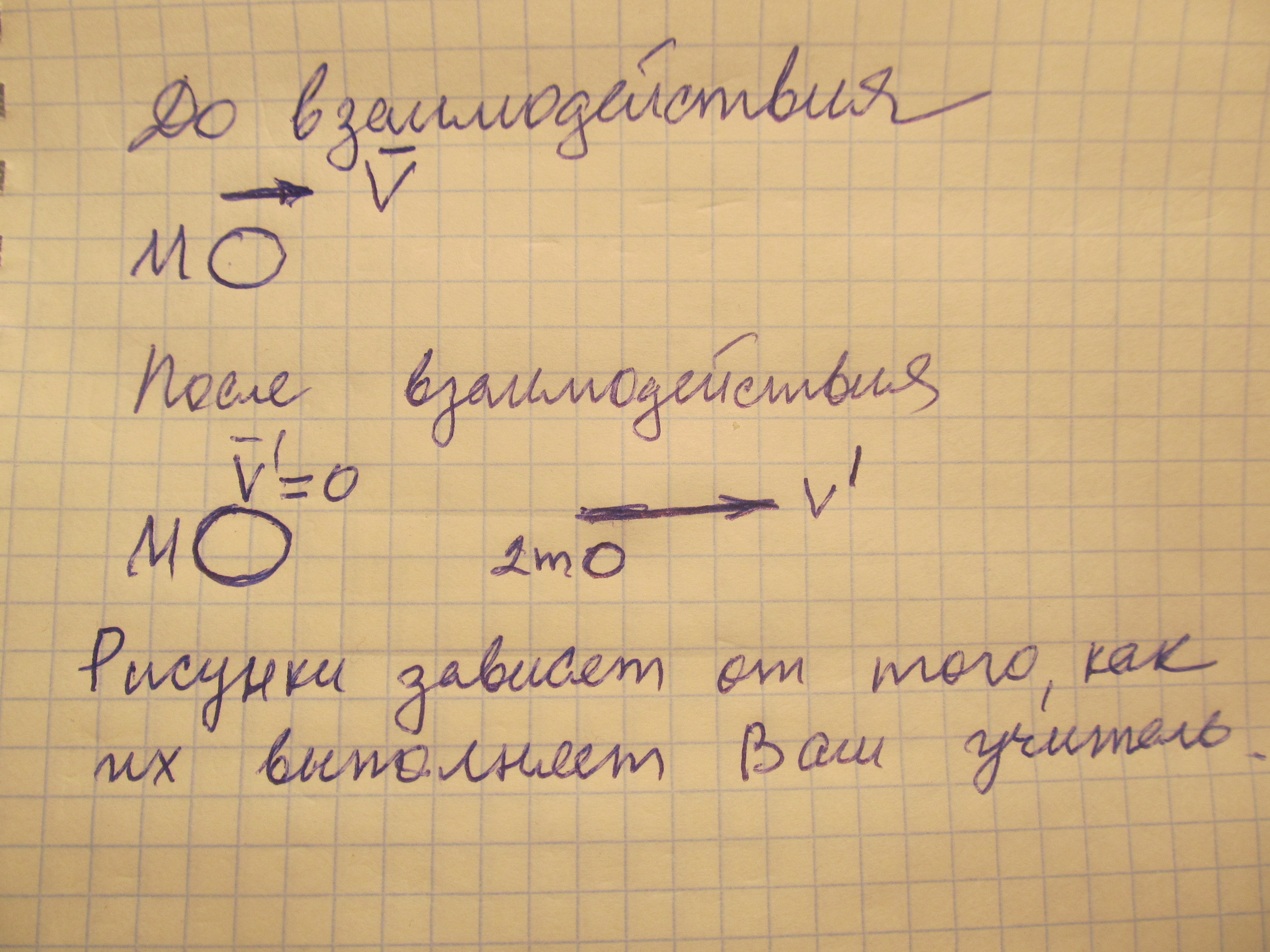 Рисунки: 1) до взаимодействия. Большой кружок массой М и над ним вектор V; 2) после взаимодействия. Большой кружок М и над ним V'=0; рядом маленький массой 2m и над ним длинный вектор v'