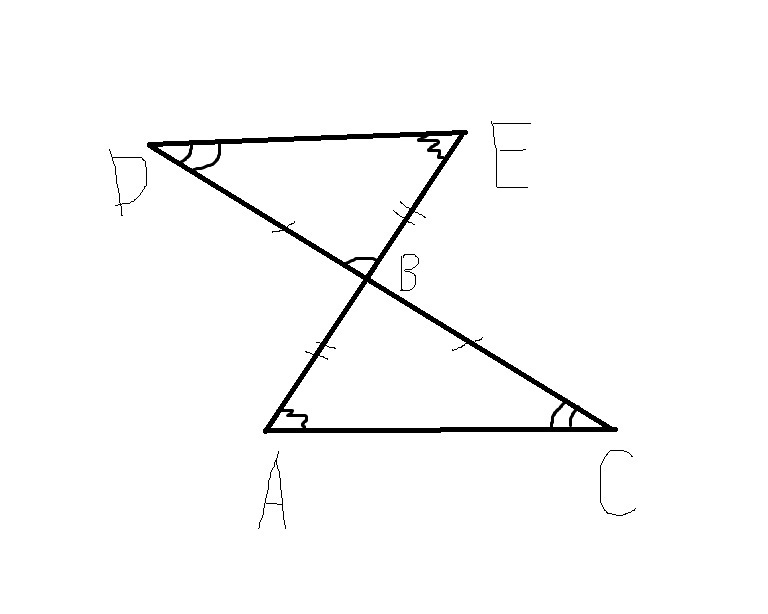 Отрезки AE и DC пересекаются в точке В,являющейся серединой каждого из них.а)Докажите,что треугольники АВС и ЕBD равны. б)найдите углы А и С треугольника АВС,если в треугольнике BDE угол D= 47 градусам,угол Е=42 градусам.