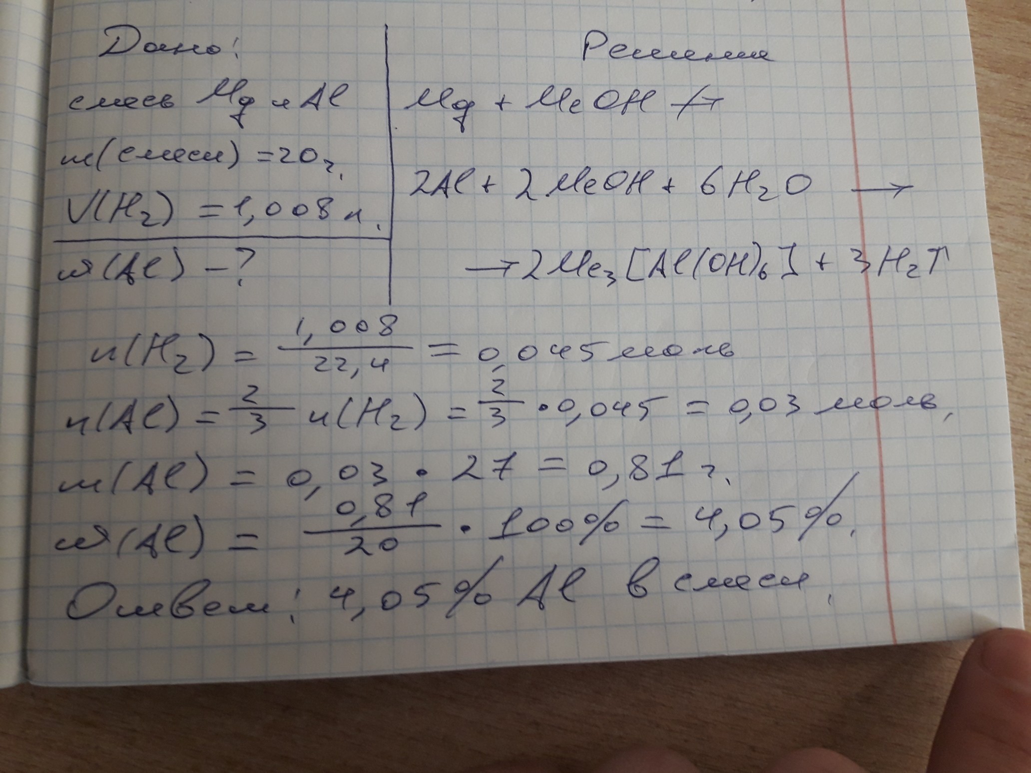 Зробіть задачу з хімії. Суміш магнію та алюмінію масою 20 г помістили у водний розчин лугу.Виділилося 1,008 л водню.Визначити масову частку алюмінію в суміші