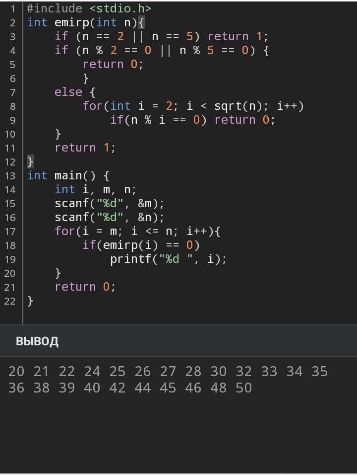 m меньше n, n и m натуральные числа. Вывести на экран числа от m до n которые не являются простыми