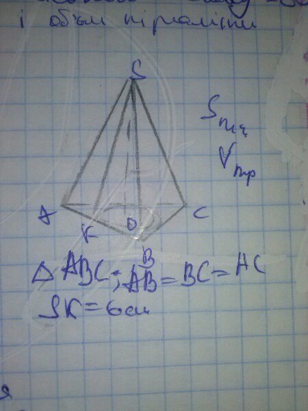 Апофема правильної трикутної піраміди дорівнює 6 см, а радіус кола, вписаного в її основу, корінь 3 см. Обчисліть бічну поверхню піраміди.