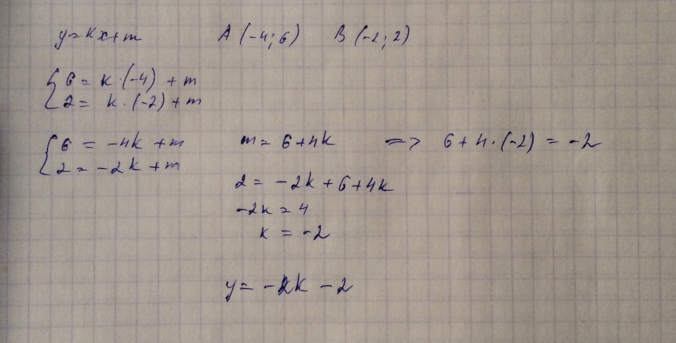 График функции y=kx+m проходит через точки А(-4;6)и В(-2;2) Найдите формулу, которая задаёт эту функцию