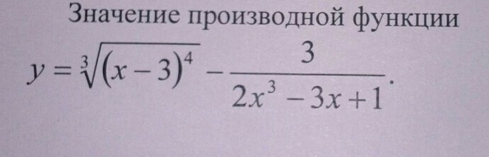 y=sqrt[3]{(x-3)^{4} } -frac{3}{2x^{3} -3x+1}=(x-3)^{frac{4}{3} }-frac{3}{2x^{3}-3x+1 }\\y'=frac{4}{3}(x-3)^{frac{1}{3} }*(x-3)'-frac{3'*(2x^{3}-3x+1)-3*(2x^{3}-3x+1)'}{(2x^{3} -3x+1)^{2} }=frac{4sqrt[3]{x-3} }{3}-frac{-3*(6x^{2}-3) }{(2x^{3}-3x+1)^{2}}=frac{4sqrt[3]{x-3} }{3}+frac{9(2x^{2}-1) }{(2x^{3}-3x+1)^{2}}