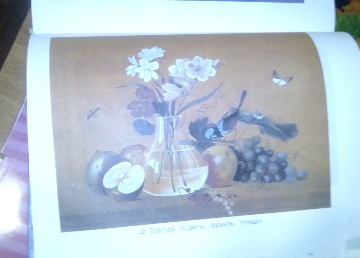 моё внимание на полотне привлек пейзаж в центре холста художник изобразил вазу с цветами с права и с лева от вазы художник поместил фрукты спелость и сочность винограда автор подчеркнул с помощью красок райское пеночка сидящая на виноградной кисти, передает эта картина основная мысль произвидения заключается в том что автор рисовал это с любовью