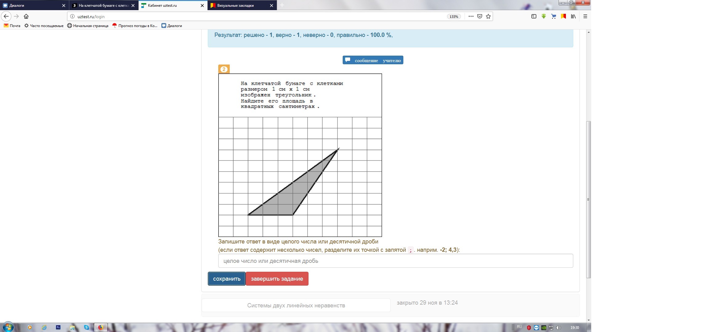 На клетчатой бумаге с клетками размером 1 см × 1 см изображен треугольник (см. рисунок). Найдите его площадь в квадратных сантиметрах. /