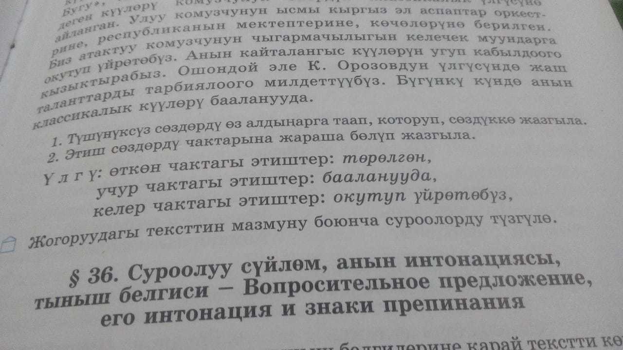 Помогите пожалуйста сделать задание по тексту, под текстом. И ещё нужно написать 3 сууроо тузуу, жаз бутур. (Везде кыргызская у и о)