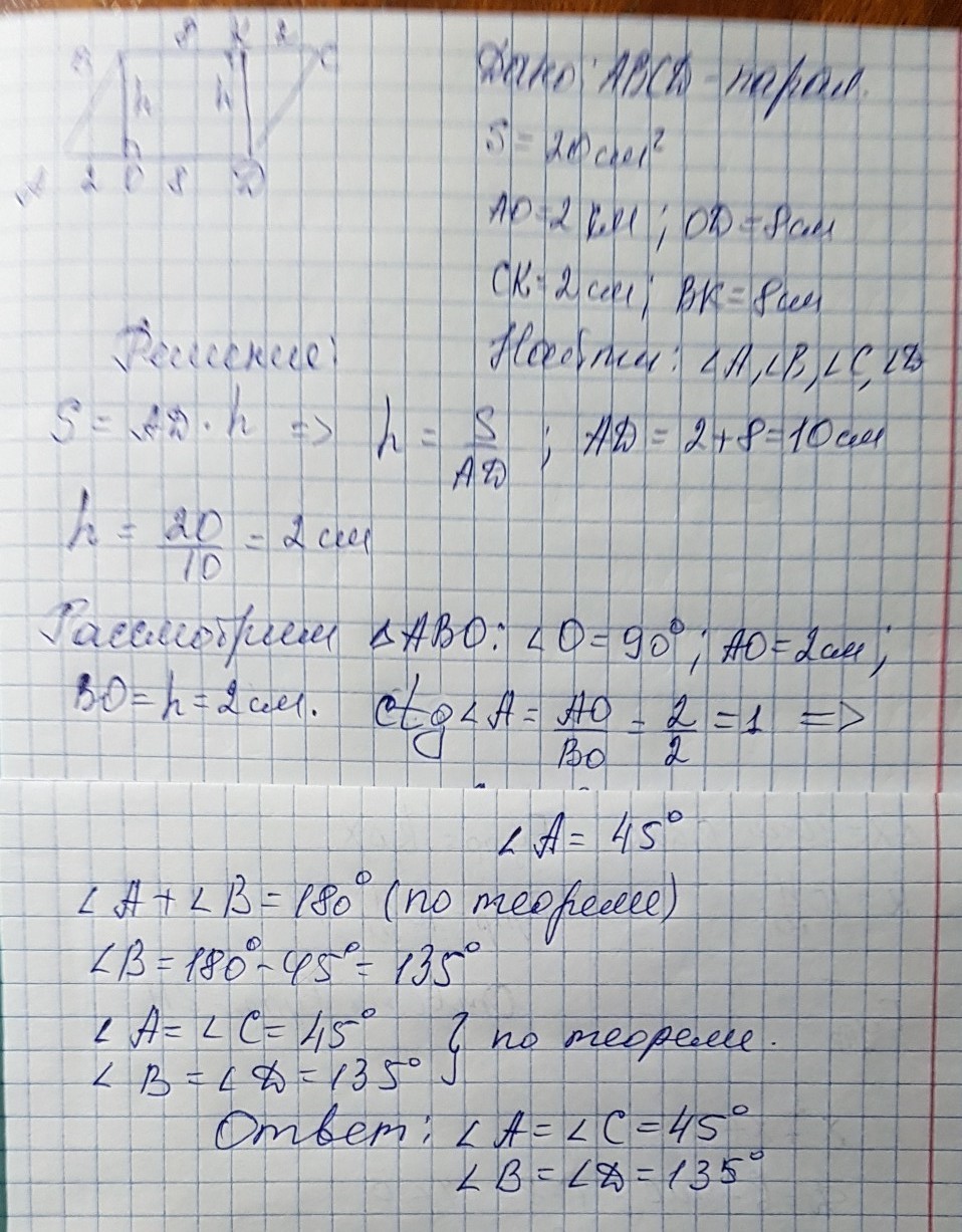Найдите углы параллелограмма,если его площадь равна 20 см² ,а высота,проведенная из вершины тупого угла,делит одну из сторону на отрезки 2 см и 8 см,считая от вершины острого угла. С рисунком,пожалуйста.