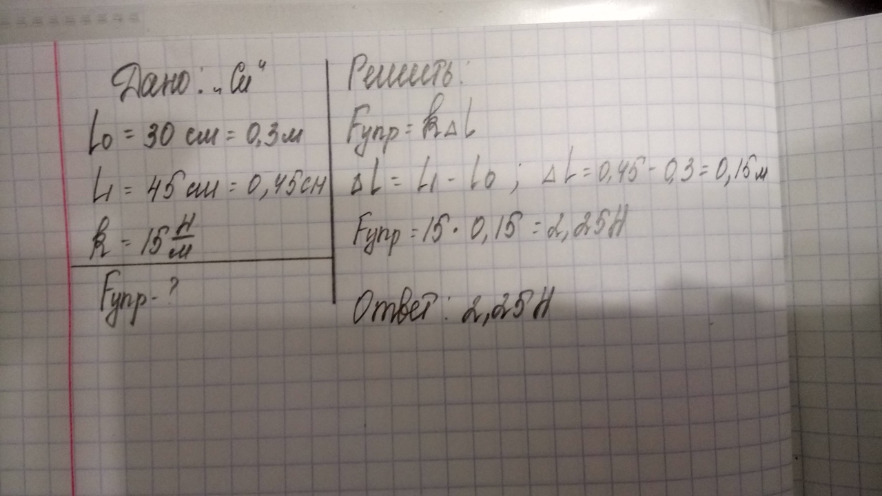 Какова сила упругости, возникающая в резиновом шнуре, если его первоначальная длина 30 см, а после деформации стала 45 см. Коэффициент жесткости равен 15 Н/м.