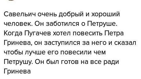 савельич очень добрый и хороший человек Он заботится о Петруше. когда Пугачёва хотел повесить Петрушу он заступился за него и и сказал что они повесили лучше его чем петрушу он даже хотел покорится Пугачёву лишь бы только чтобы они помиловали петрушу