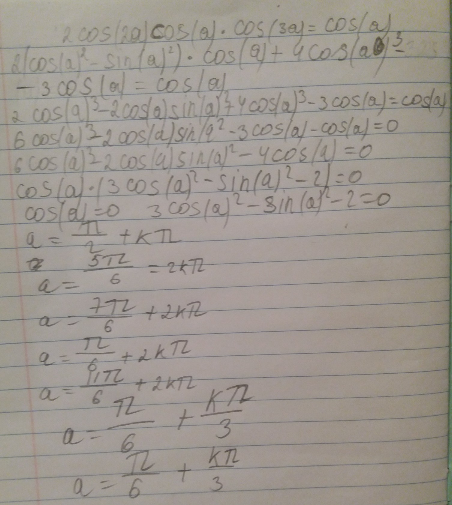 Нужно доказать, что 2*sin2a*cosa+cos3a равно cosa.. Сам угол находить не нужно)